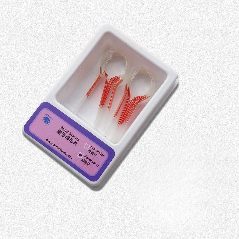 【Real Materials】 Dental matrices are all made of polyester and are safe to use. 【More Dental Consumables】There are many types of dental matrix bands, this is just one. If you have any questions, please contact us and we will answer them at any time! Matrix ends are covered with a special glue layer for side-to-side conjunction. ---- No matrix retainer required ---- Alcohol immersion disinfection,disposable use,can not be disinfected under high temperature and high pressure; ---- Installation of self-adhesive matrix: 1.Install matrix 2.Remove red protective layer from matrix side 3.Stick glued matrix sides with each other Polyester Matrices For Premolar and Molar Packing : 10 pcs/box(For Premolar / Molar)