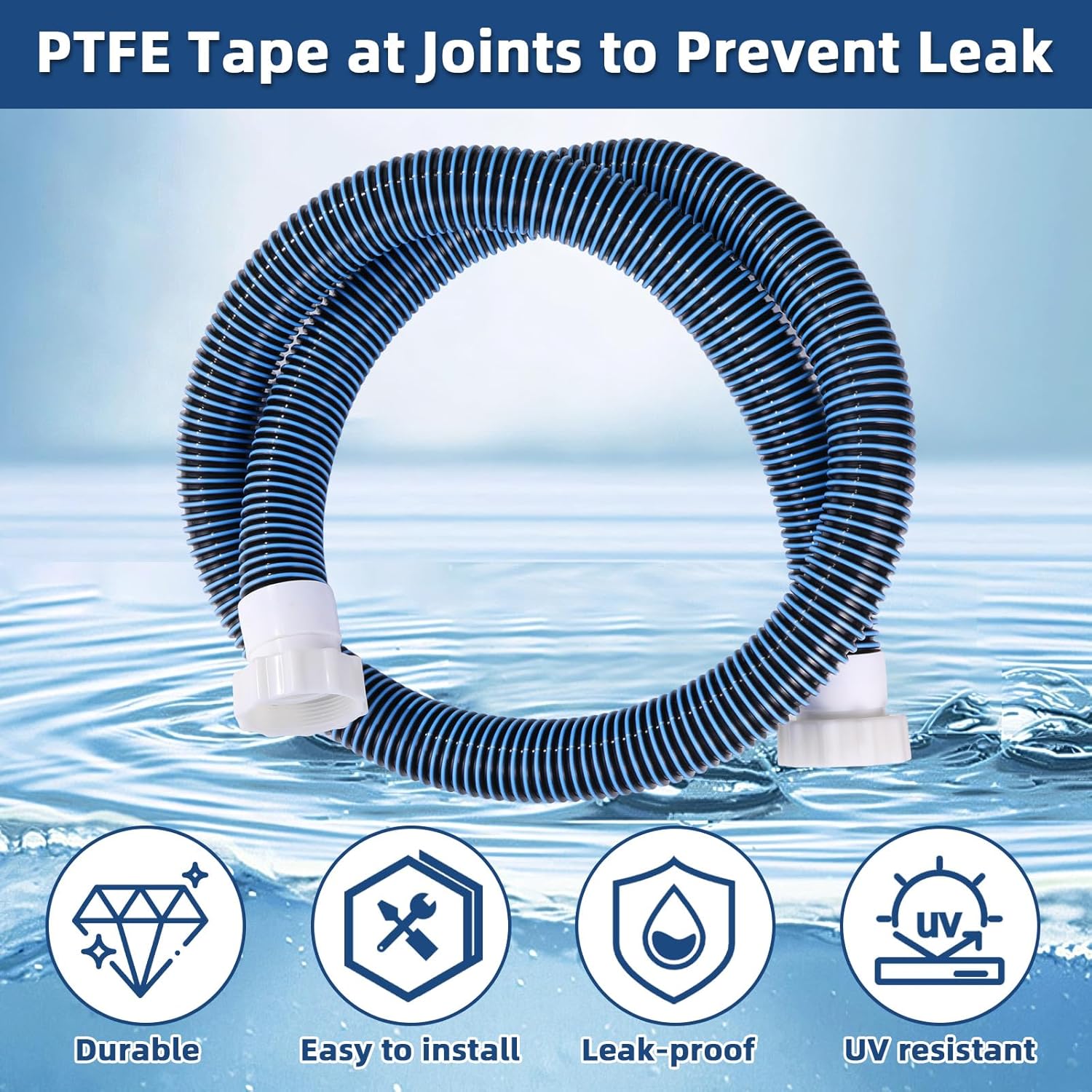 2026 Upgrade 2 Pack 1 1/2 Pool Hose for Above Ground Pools 6ft EVA Long Pool Pump Replacement Filter Hoses 1.5" Swimming Pool Filter Hose for Filter Pumps, Saltwater Systems and Sand filters (Blue)These premium EVA pool hoses provide the nice connection solution for above-ground pool systems. Their heavy-duty construction maintains optimal water circulation between your pool and filtration system, ensuring efficient cleaning and sparkling water. The weather-resistant design offers superior leak protection and UV stability, delivering reliable performance year after year. Specifications: Material: Ethylene Vinyl Acetate (EVA) Size: 6ft/180cm Color: Blue Package Includes: 2 x pool hose for above ground pools 4 x gray leak-resistant rubber rings Engineered for lasting performance and effortless installation, this pool hose set creates a secure connection between your pool and filtration system. Whether upgrading old components or installing new equipment, these hoses help maintain a refreshing, clean swimming environment.