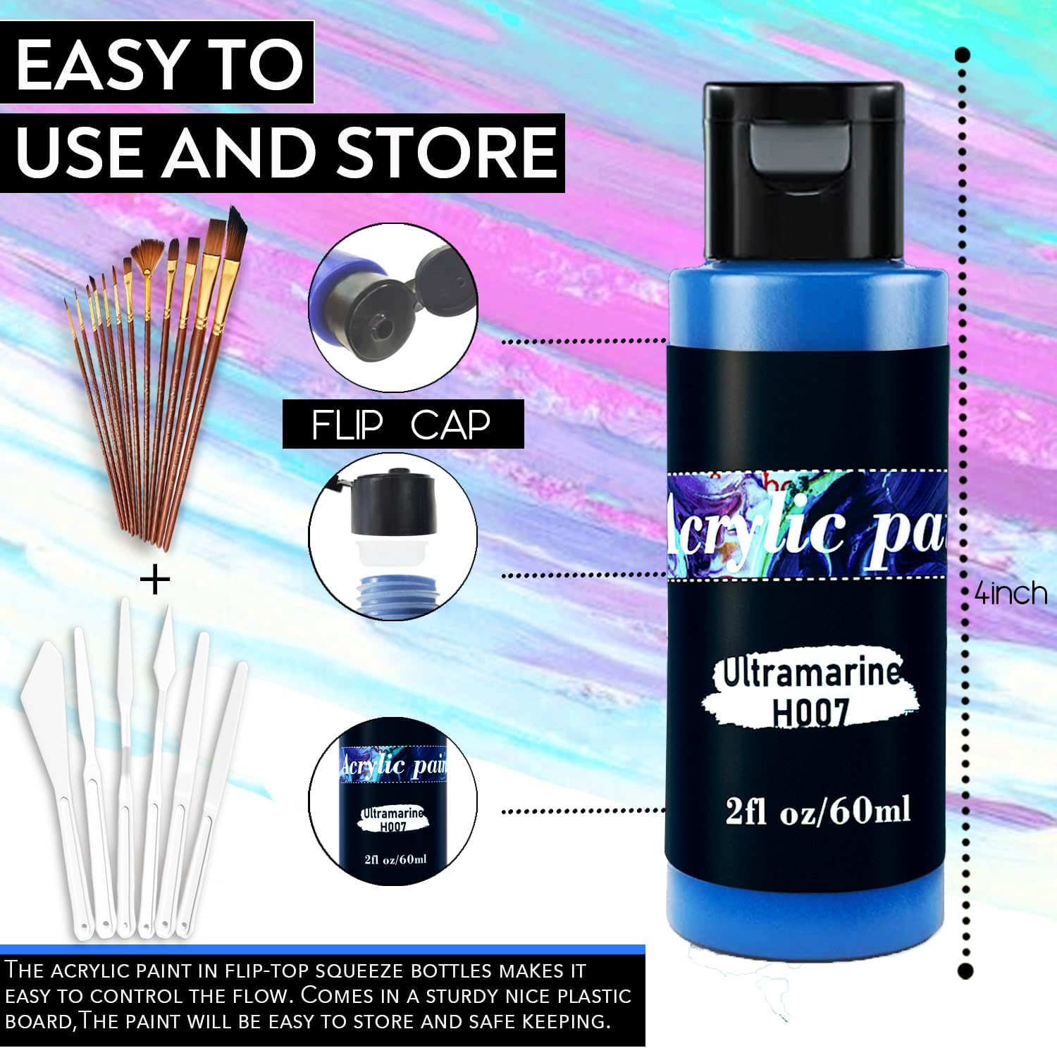 Huestry 99 Colors Acrylic Paint Set With 12 Brushes Include: Color: ---99 Vibrant Colors acrylic paint 12 different brushes ---#1 Liner,#2 Flat ,#3 Round ,#4 Anguiar ,#5 Fan,#6 Flat ,#7 Round ,#8 Filbert ,#9 Round ,#10 Flat ,#11 Round ,#12Anguiar ---6 painting knives PREMIUM QUALITY Huestry acrylic paints are water-based, have a creamy texture, and are easy to mix and layer. They have great coverage, and a little paint can go a long way on your surface. SAFETY GUARANTEE Made of premium paint material, conforming to ASTM D-4236 and EN71 standards,Huestry acrylic paint set is in rich pigment, creamy, non toxic and safe for adults, teens and kids’ creative art painting time MULTI-PURPOSE PAINT Huestry Acrylic paints for art dry quickly and stay on surfaces extremely well, permanent, waterproof and fade resistant, suitable for most surfaces like glass, rocks, nails, walls, canvas, leather, ceramic, wood, clay, crafts and more, great for art beginners, enthusiasts, professional artists, students, etc. USE ON A VARIETY OF SURFACES Huestry acrylic paints are versatile in canvas art, painting, scrap booking, Christmas, Halloween decorations and more, suitable for most surfaces, including canvas, wood, rocks, glass, stretched canvas, fabrics, stone, metal, plastic, ceramics, decorative wall, blackboard, paper, Styrofoam, plaster, terracotta and tin. Easy to mix/ Smooth / Creamy Texture ---These highly blendable acrylic paints let you mix and create the most unique colors for your crafts. Match the colors of your home to your craft projects by making stunning custom shades and smooth transitions in your gradients. ---Rich,smooth consistency that allows you to build texture and add details with a variety of tools. ---The creamy consistency and high pigments offer great covering power for large areas and fine details.The quick-dry craft paints set allow you to build layers and add details to your artwork.
