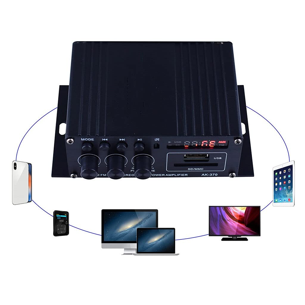 Feature: It can be connected to devices wirelessly, which is convenient and practical. Adjust the bass, treble and volume freely according to the actual situation. Only 4.91 * 2.95 * 1.57inch (L * W * H) is compact and does not take up much installation space. The digital screen clearly displays the relevant data through the red indicator. Audio amplifiers are widely used in computers, tablets, laptops, smart phones, etc. specification: Type: Audio amplifier Quantity: 1 Material: electrical components Colour: Black Power supply voltage: 12V : 5.0 Output power: 20w + 20w Impedance: 4-6Ω distance: 10 meters Input: Support SD, U disk, USB, RCA stereo Size: 12.5 * 7.5 * 4cm / 4.91 * 2.95 * 1.57inch (L * W * H) Net weight: 250 grams / 8.82 ounces package: 1 audio amplifier 1 remote control 1 *Manual notes: Due to manual measurement, please allow a deviation of 1-10 mm. Due to the difference in light and screen, the color of this item may be slightly different from the picture.
