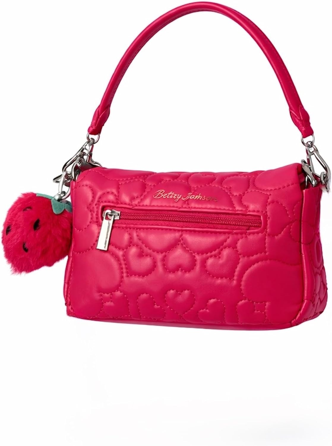 Turn every outfit into a statement with this Betsey Johnson Quilted Heart Shoulder Bag in Dressy Pink. Designed with bold personality and playful glam, this eye-catching silhouette features allover heart quilting, a vibrant saturated pink finish, and signature Betsey Johnson script hardware across the front. The standout strawberry faux-fur charm adds whimsical flair, making this bag both fashion-forward and instantly recognizable. The structured yet compact silhouette keeps your essentials organized without bulk, while the top handle and detachable adjustable strap allow you to wear it as a chic shoulder bag or hands-free crossbody. Perfect for brunch, date nights, vacations, concerts, or anytime you want your accessories to steal the spotlight — this bag delivers fun, feminine energy with designer-inspired detail.