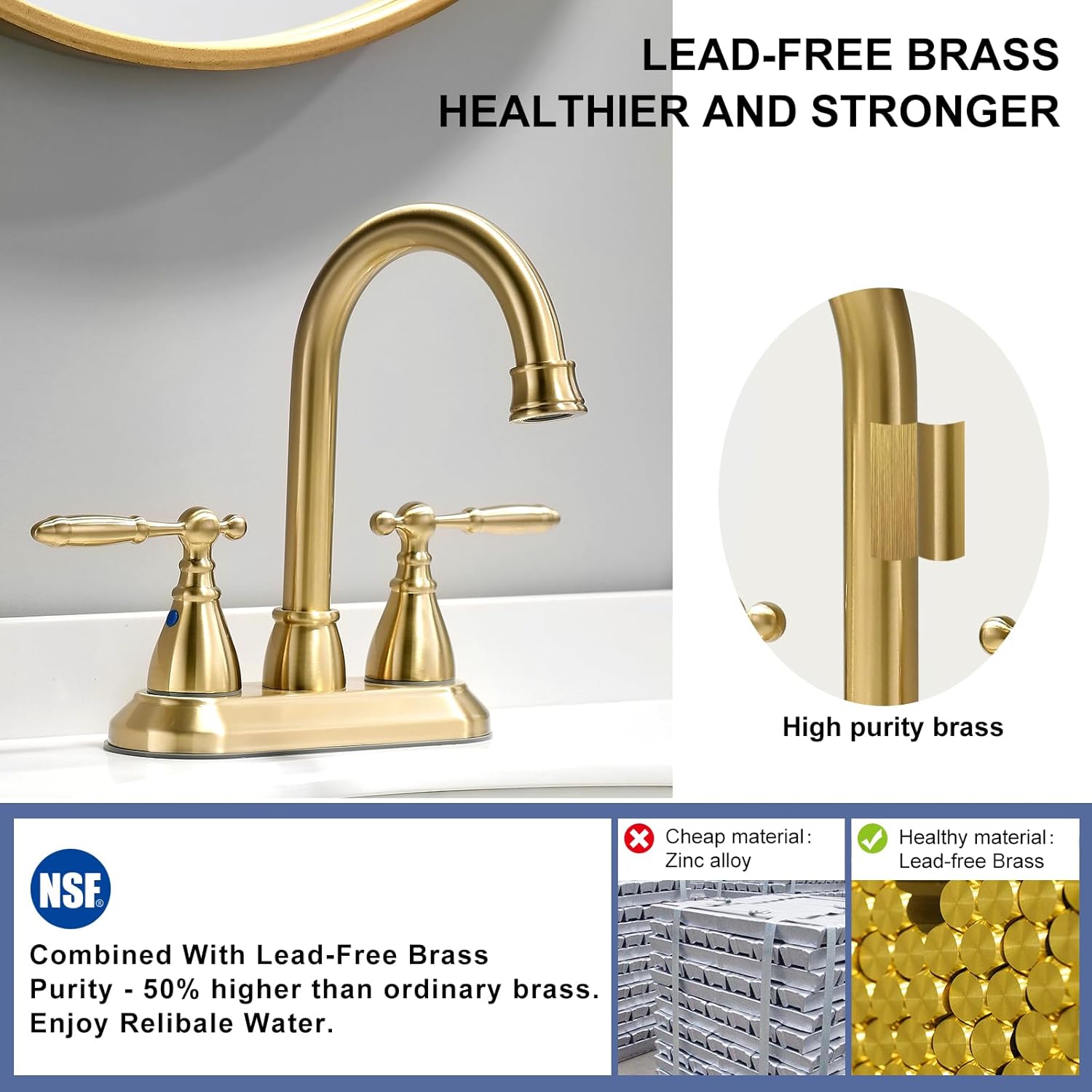 Brushed Gold Bathroom Faucet with Pop-up Drain Assembly, 2 Handles Centerset Bathroom Sink Faucet 4 Inch with 360° Swivel Spout, Stainless Steel Faucet for Vanity Sink with Water Supply Lines
