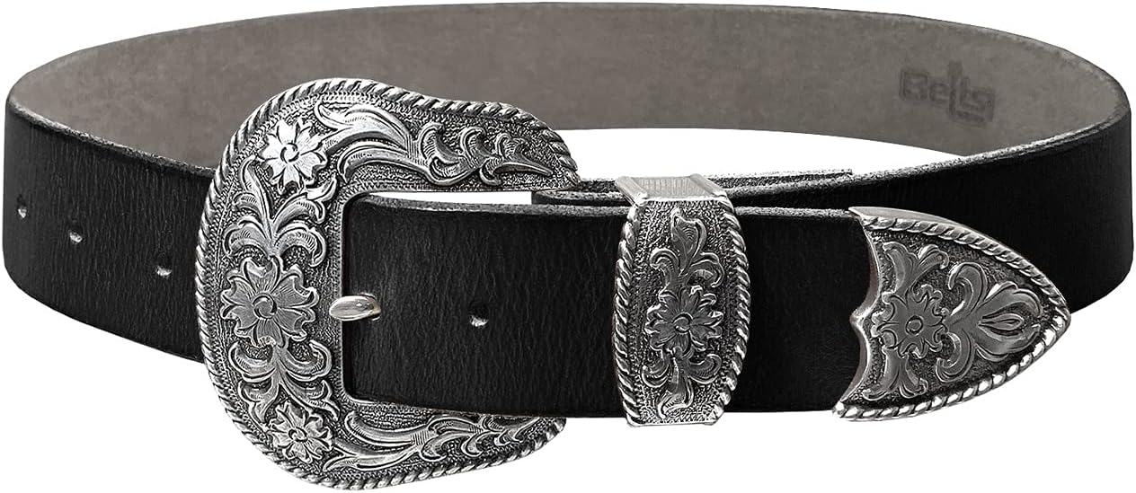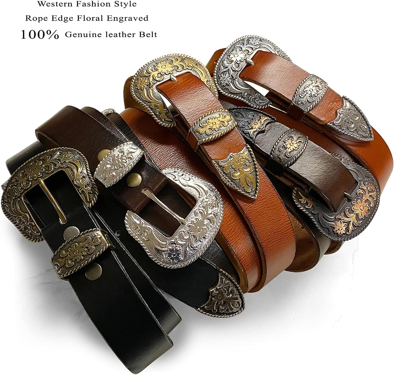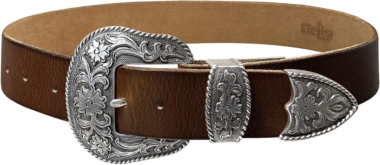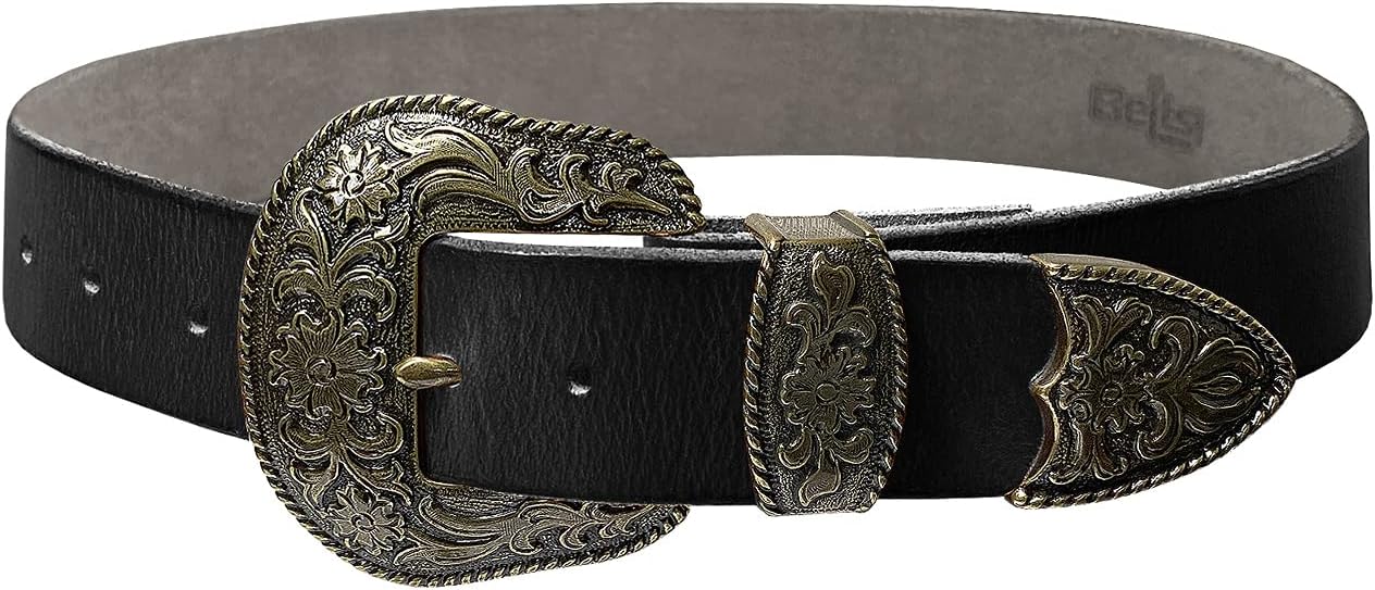 Made from high-quality one-piece full-grain cowhide leather 100% Genuine leather.Hand Polished antique gold rope edge floral engraved buckle set. Buckle Material: Zinc. 1-1/2"(38mm) wide belt with 7 belt holes for plenty of room for adjustments to offer maximum comfort. Convenient snap system for interchanging buckles making it a versatile strap for different occasions.10 oz or 4mm thick vegetable tanned leather with a wonderful vintage finish which ages well and keeps its warm patina over time. classic casual Leather belt never out of fashion.Our belts are measured from the fold where the buckle is attached to the middle hole. If you wanted to get the best size we recommend measuring a belt that works for you from the fold to the hole where you wear the belt.