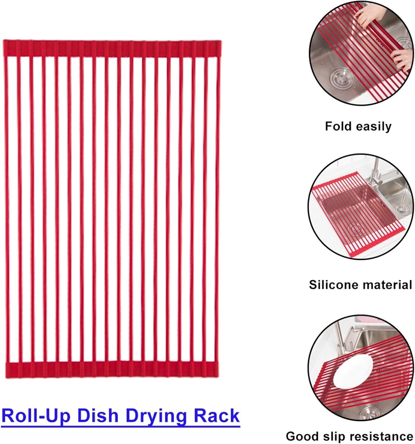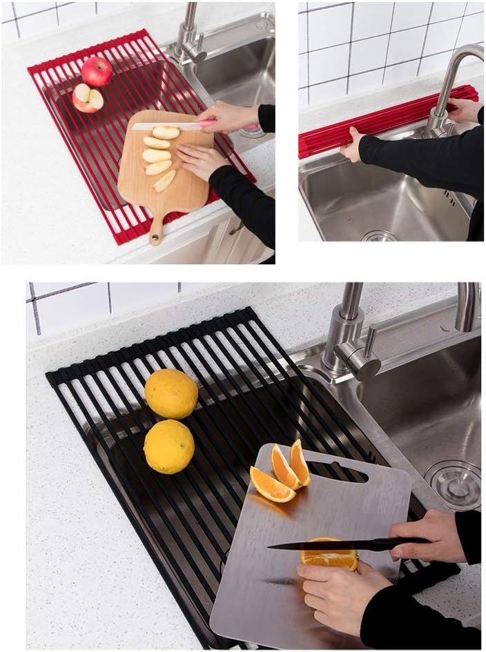 It can air-drying any washed tableware, cookware, bakeware, stoneware, flatware, kitchenware and fragile glassware,which looks great.PRODUCT SPECIFICATIONS: Size:52*33cm/20.5*13inchMaterial:Food grade SUS304 Stainless Steel, siliconeTube quantity: 18 pipes Heat Resistance: 460°F (240°C)Color: Black , Gray , RedWeight: 1kgLoad weight: 33 lbsCleaning method:clean it in hot water,or run it through the dishwasherApplicable place:roll up drying-- For holding heavy pots, fry pans, China, ceramic, porcelain-- For cooking prep works: holding cutting board, filling liquid containers (coffee cup, babies milk, etc.) or powders, pancake or cake mix, etc. makes mess right into the sink.-- For holding wet vegetable and fruits temporary like a salad colander or vegetable washing bowl. -- For holding bread, cake to dry like a cooling rack much quicker. For holding hot pots & pans, or putting frozen items to thaw, etc. -- Frees up more counter space-- Rolls up quickly and neatly into a compact cylinder to save space, stores horizontally or vertically -- Also perfect for camping, picnic, and other outdoor activities.Note:-- To avoid buying products with incorrect dimensions, please measure the kitchen sink before placing an order.-- About the product: We measure manually, the size can be an error of 1-3 cm, 【1(in) = 2.54cm】which is a problem qualité.Endue to different camera angles, there will be some color difference due to various factors, please refer to the actual product.
