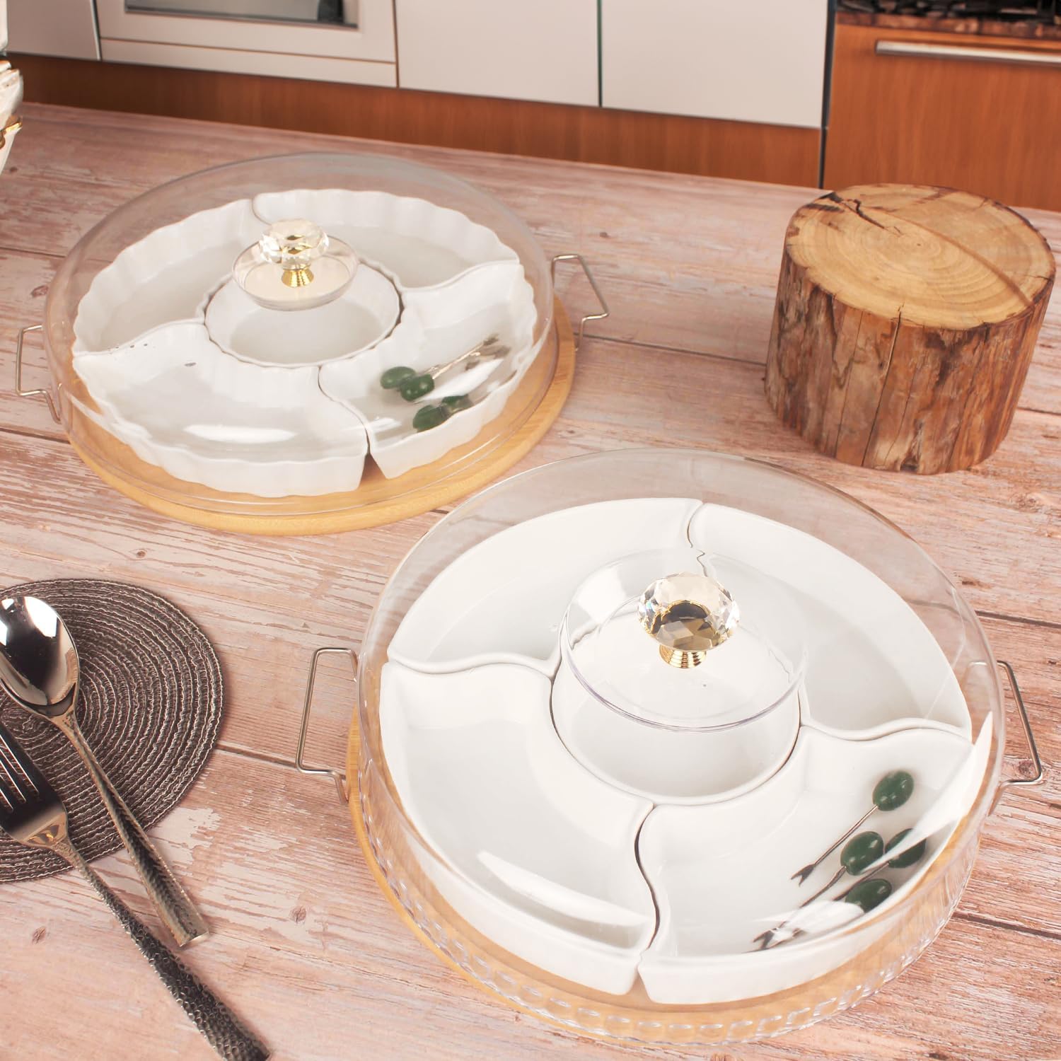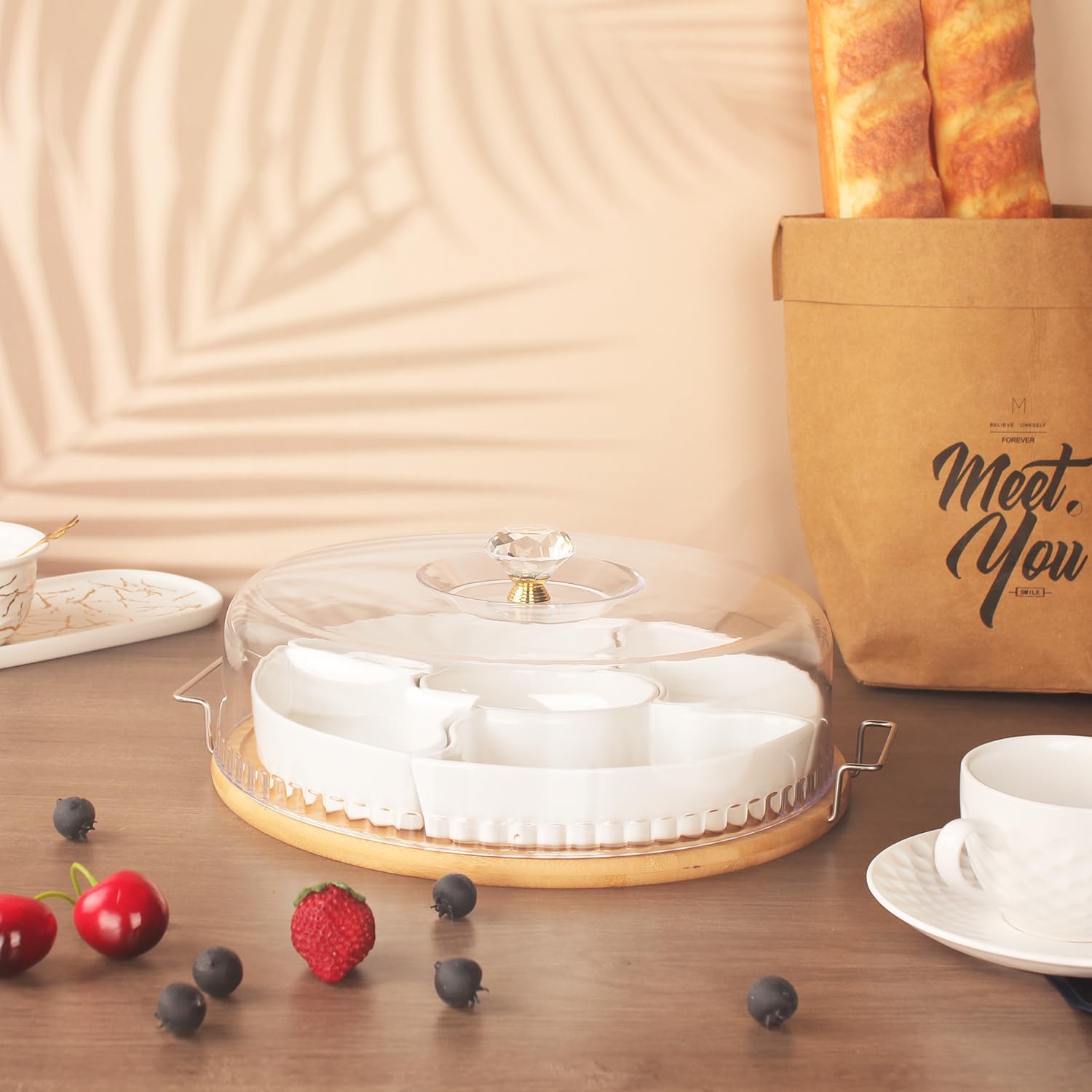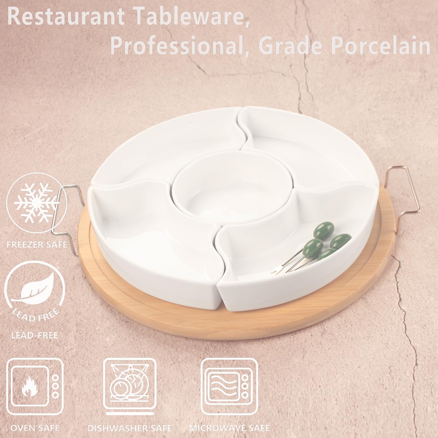 LIUYWYHCF Divided Snack Tray with Lid, 5 Removable Snack Deli Containers with 4 Forks for Party Serving Plate, Fruit Tray with Dips, Snacks, Reusable for Meal Prep Stylish and Versatile - This tableware set includes 4 bowls with a small condiment bowl in the middle, all of which have separate spaces carved on the 11-inch (12.8-inch with two handles) large wooden round tray, and a plastic lid that covers all bowls, and 4 forks. These tableware are very sturdy and durable, with a simple and elegant appearance. A Must-Have for Party Hosts - There are five compartments for storing different types of food. You can serve chips and sauces, candies, olives, nuts, fruits, vegetables, and a variety of appetizers. The color of the food contrasts with the white bowl, presenting an incredibly delicious taste. Functional Design and Easy to Use - All parts are separated, making it easy to refill food for the party. You don't have to take the whole tray away from the guests to refill the food. The separate compartments also make it easy to wash and store dishes. Professional Grade Porcelain Dinner Plates - This multi-purpose dinner plate is made of durable porcelain, a premium lead-free ceramic that is unbreakable and stronger than pottery. Dishwasher, microwave and freezer safe. Usage: These trays/plates/divider bowls are gorgeous and elegant, will add a beautiful look to any event, 5 removable platters are perfect for chopped vegetables, nut platters, candy platters, vegetables and sauces at weddings, family gatherings, festivals, birthday parties and various events.