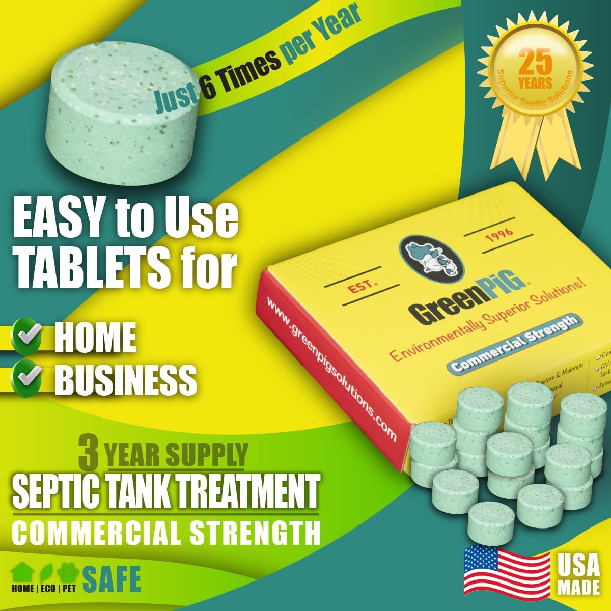 Green Pig Commercial Strength Septic Tank Treatment is a great solution for maintaining a healthy septic system, utilizing powerful septic tank enzymes to effectively dissolve clogs and prevent costly repairs. This sewage cleaner is safe for both home and business use, rapidly tackles blockages in drain fields, and eliminates the root causes of septic system failures. By incorporating billions of active bacteria cultures, Green Pig's formulation activates septic tank enzymes, providing effective breakdown of solids and waste throughout the entire septic system, including the leach field. With a concentrated formula, this septic tank treatment is 2.5 times stronger than its consumer counterpart, delivering robust results by digesting grease, fats, oils, paper, and organic matter. Offering maximum value with minimal effort, Green Pig Septic Tank Treatment requires just 6 applications per year. Simply drop in a dissolvable tablet every two months for effortless maintenance, making it an economical choice. The treatment is designed to support 500, 1000, and 1500-gallon tanks, as well as leach lines and drain lines, for both aerobic and anaerobic systems. Featuring a formaldehyde-free formulation, Green Pig is gentle on pipes and plumbing, offering a sustainable approach to septic maintenance. This product not only clears existing clogs but also prevents future buildup, maintaining optimal drainage and keeping your system in proper working order. By breaking down waste into a liquid form, Green Pig allows organic waste to flow easily through leach lines, helping it return to the earth naturally filtered and safe for the environment.