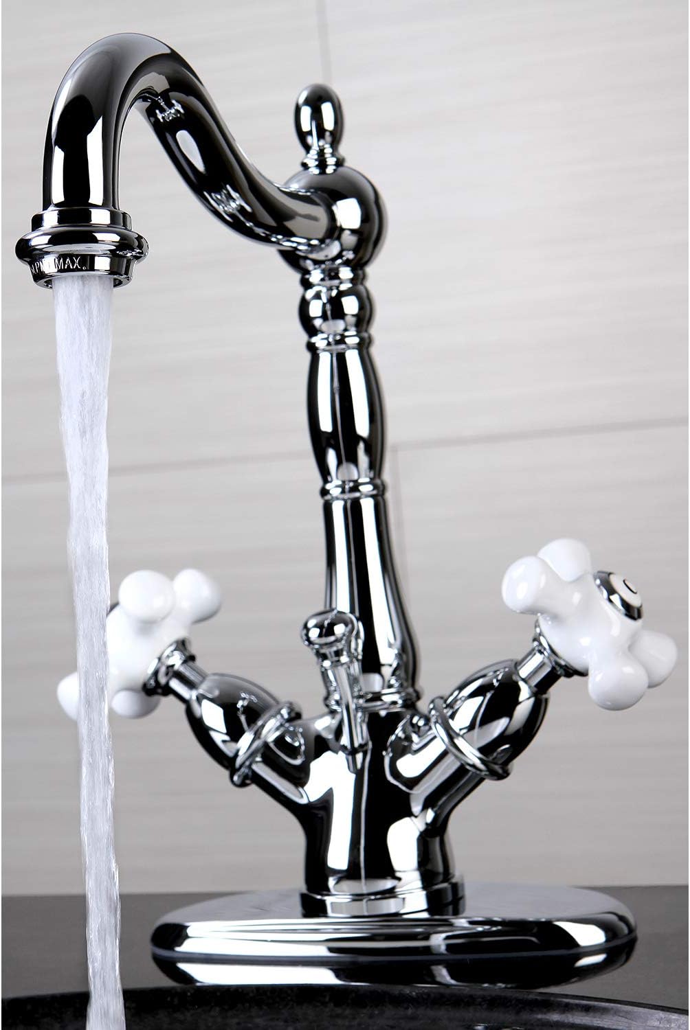 Kingston Brass KS1431PX Heritage Mono Deck Mount Bathroom Faucet, 6 1/2" Spout Reach, ChromeTwo Handle Deck Mount, 1 Hole Sink Application, 4" Centerset, 1 hole 4" centerset installation, Fabricated from solid brass material for durability and reliability, Premium color finish resist tarnishing and corrosion, 1/4 turn On/Off water control mechanism, 1/2" IPS male threaded inlets with flexible braided stainless steel supply lines, Ceramic disc cartridge, Max 1.2 GPM/4.5 LPM at 60 PSI. California and Vermont Restricted, Integrated removable rator, 6 1/2" spout reach from faucet body, 8" overall height.Kingston Brass KS1431PX Heritage Mono Deck Mount Bathroom Faucet, 6 1/2" Spout Reach, Chrome Features: Brass Construction Chrome Finish Max 1.2 GPM/4.5 LPM at 60 PSI California and Vermont Restricted Kingston Brass KS1431PX Classic Lavatory Faucet Polished Chrome 1/4 Turn Ceramic Disk Cartridge Porcelain Cross Handle Matching Pop-up Included Single Hole Installation 7" Spout Reac