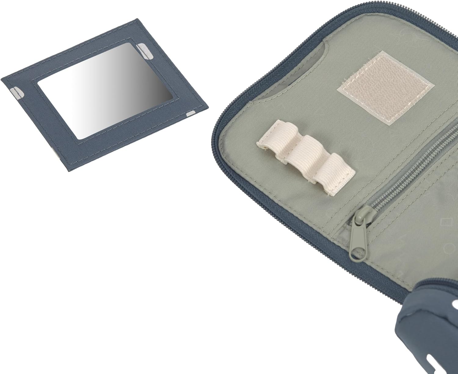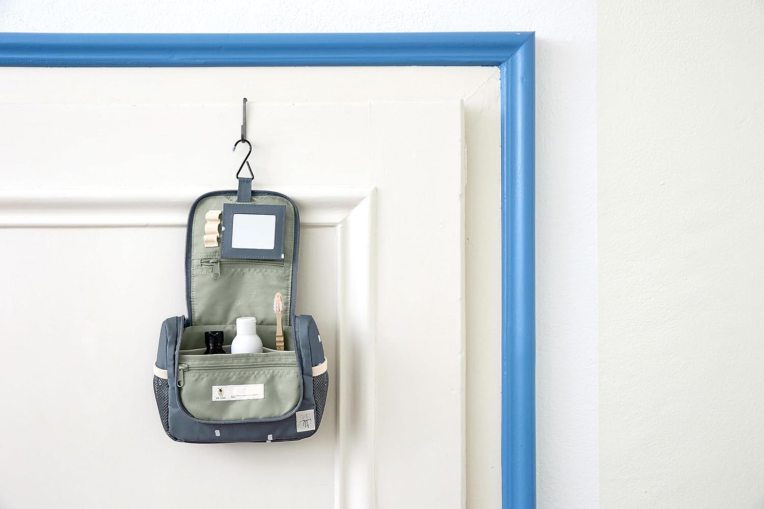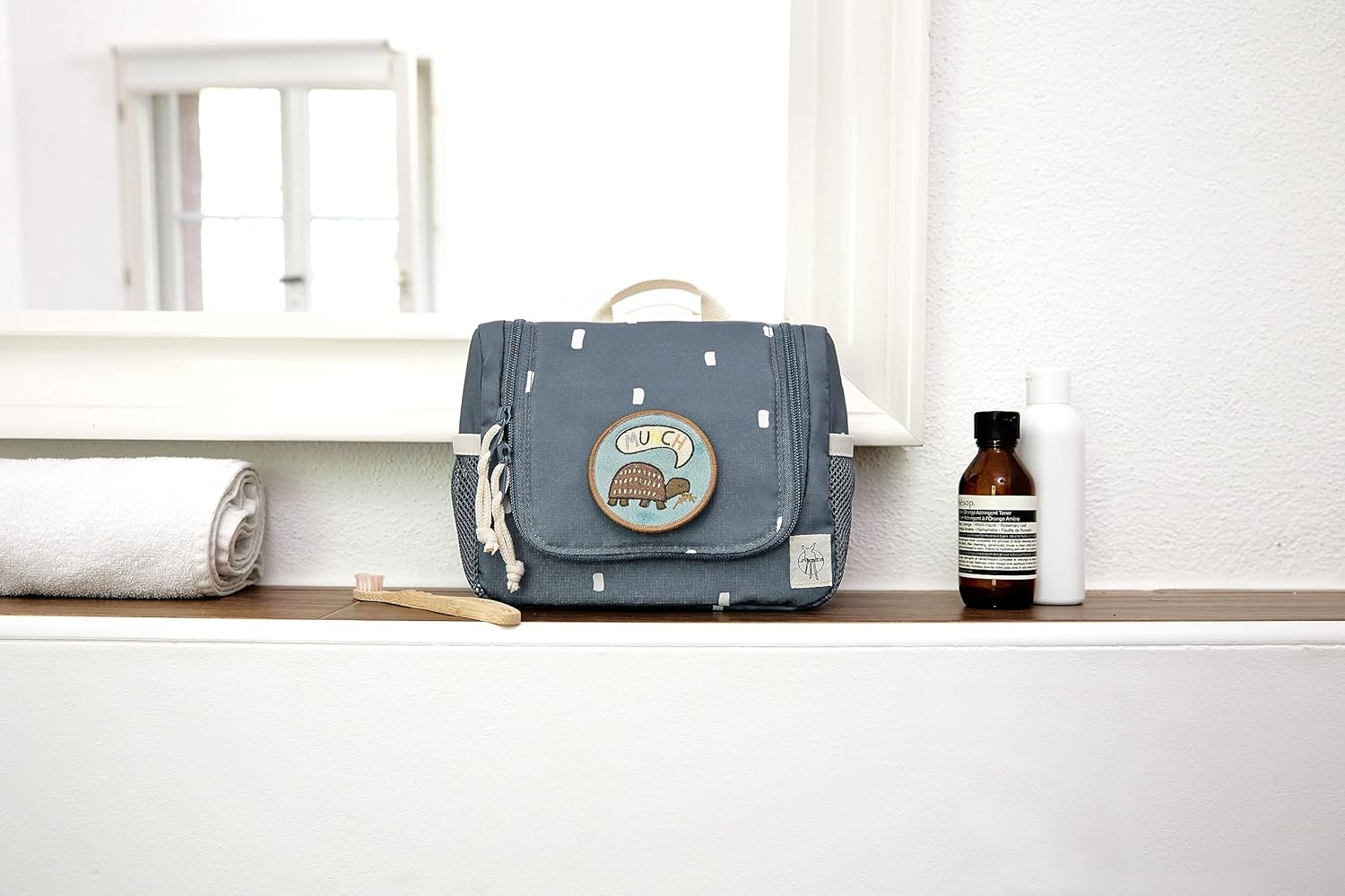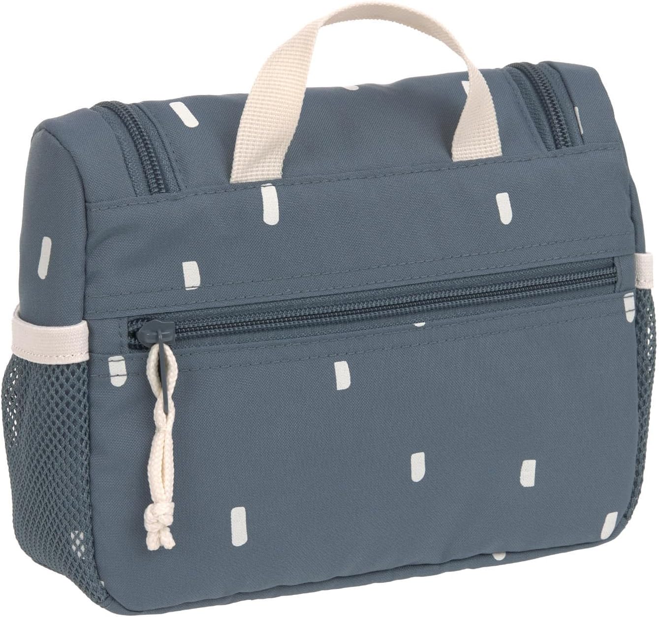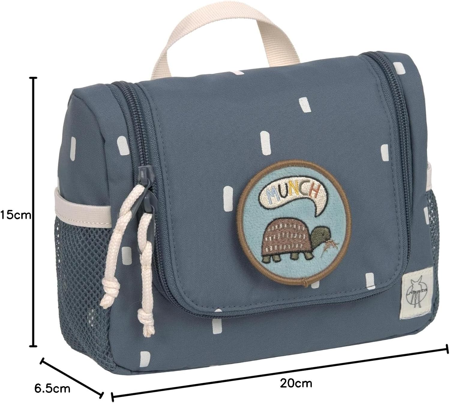 Simple design meets individual design - The LÄSSIG toiletry bag from the Happy Prints collection impresses with its understated look and leaves space for creativity. With the cute patches from the LÄSSIG range, the little ones can let their imagination run wild and customise the toiletry bag according to their wishes. The patches can be easily attached with a loop with a press stud and replaced as desired. Whether on holidays, during sports or for overnight stays with family and friends, the toiletry bag is ideal for first trips, short trips or overnight trips with its practical storage compartments. The clear main compartment can store soap, shower gel, cream and hair brush. Toothbrush, toothpaste and accessories such as hair clips can be stored in two mesh compartments and the separate zip compartments on the inside. Particularly practical are the water-repellent outer material, the hook for hanging and removable mirrors. The name tag excludes confusion. Features: - Main compartment - Organization compartments - Hanging hook - Mesh pocket outside - Zip pocket - Removable mirror - Name tag - Water-repellent Instructions for use: Do not iron, do not bleach, do not machine dry, do not dry clean, do not wash.