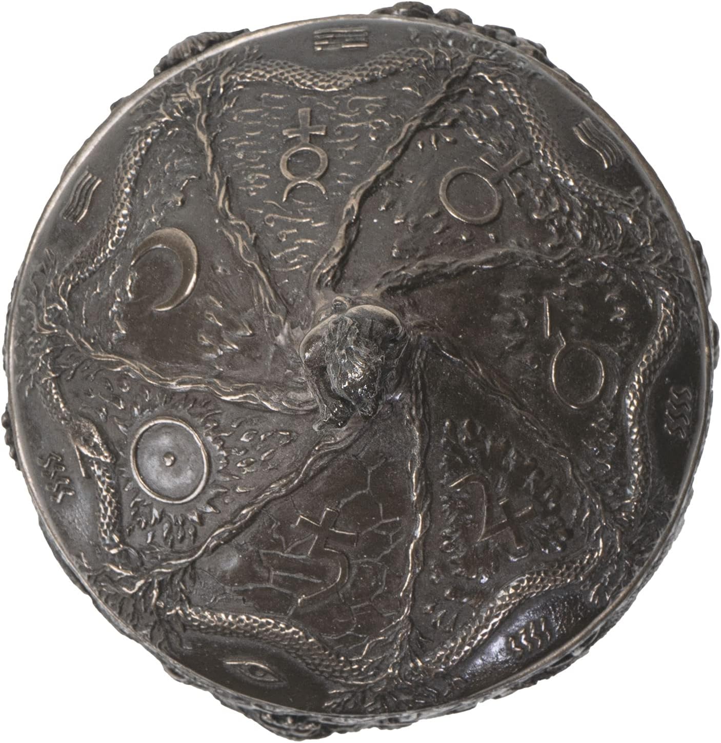 This Pandora's box measures 5.5"W x 5.5"L x 8"H approximately. In Greek mythology, Pandora was the first human woman. Created by the gods at the behest of Zeus as a punishment to man, Pando came to Earth with a jar (later versions call it a box) filled with all the evils of humanity. Pandora opened the jar and spread the contents, leaving only hope inside the jar when she closed the lid.