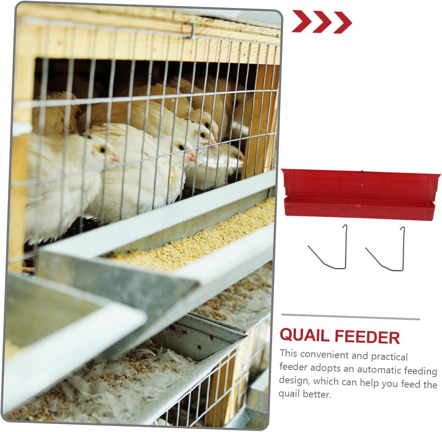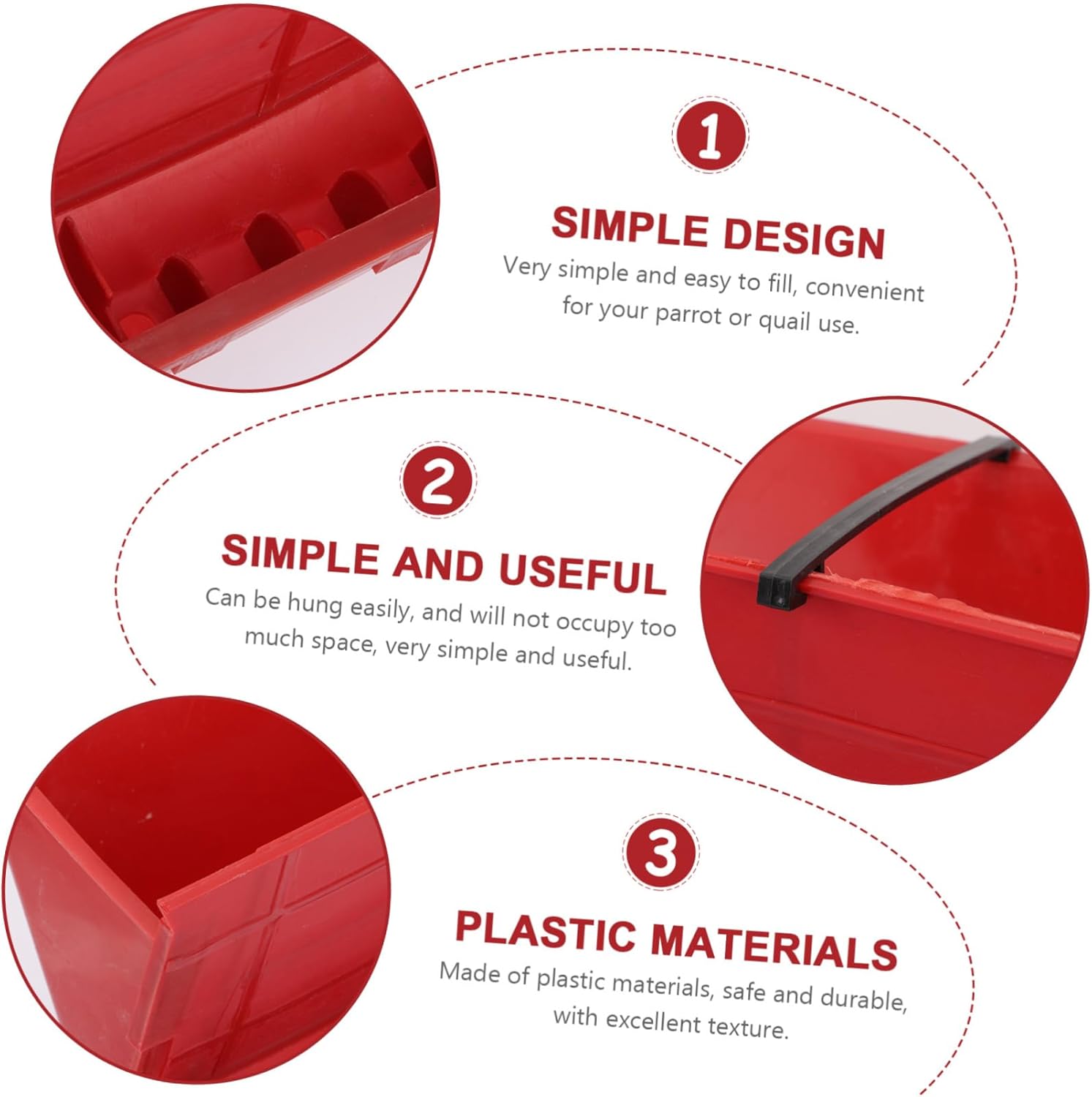 Package List 1 x Quail Feeder Features -Size: 57.50X16.00X15.00cm/22.60X6.29X5.89in Quail Feeder -Material: Plastic. quail accessories -Color: Red. Quail Feeding Accessories - This food feeder is suitable and convenient for birds animals, such as parrot, pigeon, quails, etc Feeder for Quail. - The scientific design makes it have a larger capacity, making it easier for you to use Food Container for Quail. - Carefully selected material with stable performance and Quail Feeding Equipment. - Lightweight, and washable, convenient for daily feeding quails use quail feeders. - Widely applied in breeding plant, home, farm and other places in need Quail Cage Plastic Feeder.Goods DescriptionQuail Feeding Tool It has detail and workmanship.quail accessories It is a creative automatic quails feeder.Quail Cage Plastic Feeder A food container to feed your quails while providing it a platform to play.Food Container for Quail Are you looking for a quails feeder that is simple and unique? This item will be a for you.water feeder for quail You will use it easily
